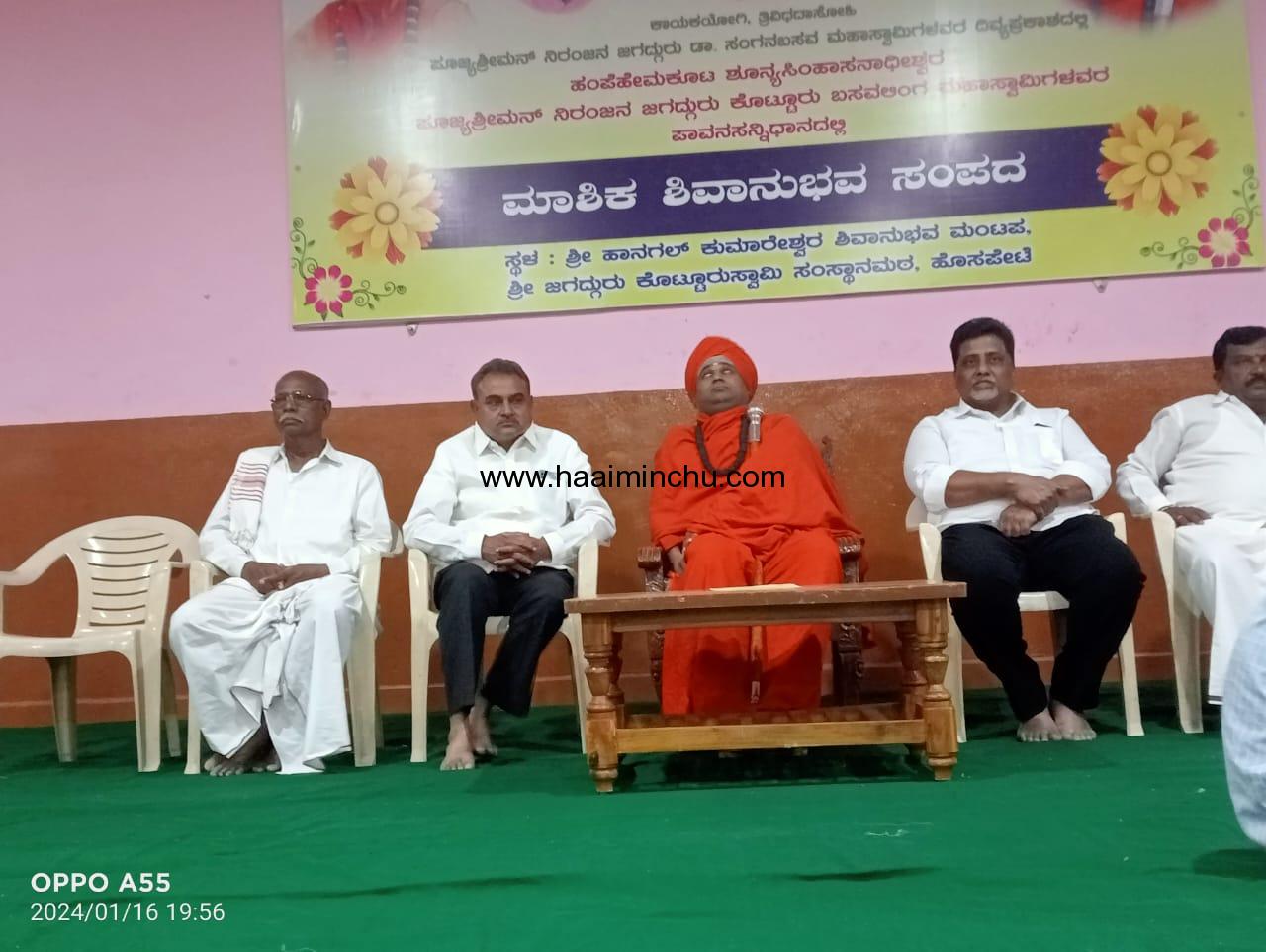 ಹೊಸಪೇಟೆ ವಿಜಯನಗರ ಜಿಲ್ಲೆ ಇಂದು ವಿಜಯ ನಗರ ಜಿಲ್ಲೆಯ ಹೊಸಪೇಟೆ ನಗರದ ಶ್ರೀ ಜಗದ್ಗುರು ಕೊಟ್ಟೂರು ಸಂಸ್ಥಾನ ಮಠ ಹೊಸಪೇಟೆಯಲ್ಲಿ ಕಾಯಕ ಯೋಗಿ ತ್ರಿವಿಧ ದಾಸೋಹಿ ಪೂಜ್ಯ ಶ್ರೀಮನ್ ಜಗದ್ಗುರು ಡಾ. ಸಂಗನಬಸವ ಮಹಾಸ್ವಾಮಿಗಳ ದಿವ್ಯ ಪ್ರಕಾಶದಲ್ಲಿ, ಹಂಪಿ ಹೇಮಕೂಟ ಶೂನ್ಯಸಿಂಹಾಸನಾದೀಶ್ವರ ಪೂಜ್ಯ ನಿರಂಜನ ಜಗದ್ಗುರು ಕೊಟ್ಟೂರು ಬಸವಲಿಂಗ ಮಹಾಸ್ವಾಮಿಗಳ ರವರ ಪಾವನಸನ್ನಿಧಾನದಲ್ಲಿ 1159 ನೇ ಮಾಸಿಕ ಶಿವಾನುಭವ ಸಂಪದ ಕಾರ್ಯಕ್ರಮವನ್ನು ಹಮ್ಮಿಕೊಳ್ಳಲಾಯಿತು.