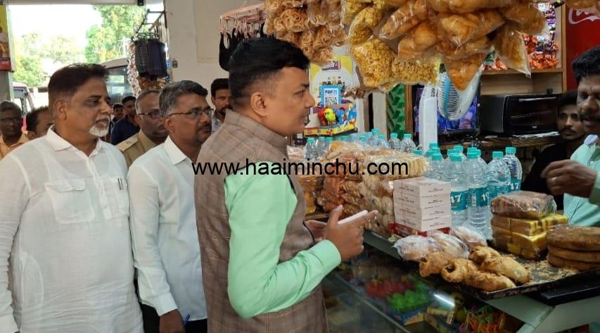 ಬಳಿಕ ಮಾರಾಟ ಮಳಿಗೆಗಳಲ್ಲಿನ ಸಿಹಿ ತಿನಿಸುಗಳು, ಕುಡಿಯುವ ನೀರಿನ ಬಾಟಲ್, ಪ್ಯಾಕಿಂಗ್ ತಿನಿಸುಗಳ ಕವರ್ ಮೇಲಿನ ವ್ಯಾಲಿಡಿಟಿ ಪರಿಶೀಲಿಸಿ ಮಾರಾಟಗಾರರಿಗೆ ಕೆಲವು ಸಲಹೆಗಳನ್ನು ನೀಡಿದರು. ನಿಲ್ದಾಣದಲ್ಲಿನ ಶುದ್ಧ ಕುಡಿಯುವ ನೀರಿನ ಘಟಕ ವೀಕ್ಷಿಸಿ ಡಿ.ಟಿ.ಓ. ರಾಜಶೇಖರ್ ಭಜಂತ್ರಿರಿಗೆ ಒಂದು ಗ್ಲಾಸ್ ನೀರು ಕುಡಿಸಿದರು. ಘಟಕದಲ್ಲಿ ಮುದ್ರಿಸಿದ್ದ 1 ಲೀಟರ್ ನೀರಿಗೆ ರೂ.2 ನಾಮಫಲಕವನ್ನು ತೆರವುಗೊಳಿಸಿ, ಉಚಿತ ಕುಡಿಯುವ ನೀರು ನೀಡುವಂತೆ ಸೂಚಿಸಿದರು.